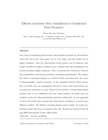 van Leeuwen, P. (2011) Efficient non-linear data assimilation in geophysical fluid dynamics. Computers & Fluids, 46 (1). pp. 52-58. ISSN 0045-7930 doi: 10.1016/j.compfluid.2010.11.011