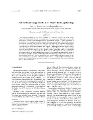 van Sebille, E. and van Leeuwen, P. J. (2007) Fast northward energy transfer in the Atlantic due to Agulhas rings. Journal of Physical Oceanography, 37 (9). pp. 2305-2315. ISSN 0022-3670 doi: 10.1175/JPO3108.1