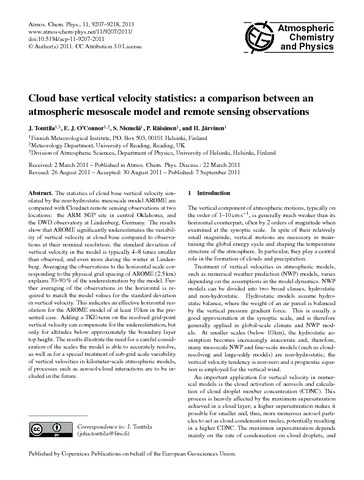 Tonttila, J., O'Connor, E. J., Niemelä, S., Räisänen, P. and Järvinen, H. (2011) Cloud-base vertical velocity statistics: a comparison between an atmospheric mesoscale model and remote sensing observations. Atmospheric Chemistry and Physics, 11 (17). pp. 9207-9218. ISSN 1680-7316 doi: 10.5194/acp-11-9207-2011