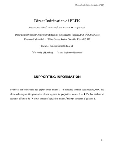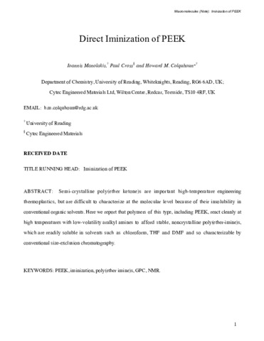 Manolakis, I., Cross, P. and Colquhoun, H. (2011) Direct iminization of PEEK. Macromolecules, 44 (19). pp. 7864-7867. ISSN 0024-9297 doi: 10.1021/ma201606q