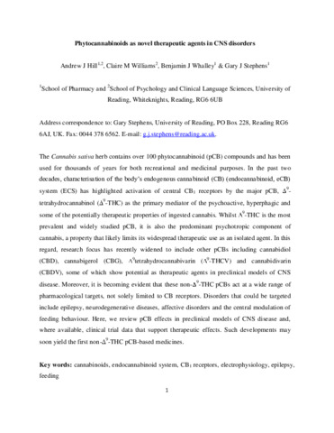The Cannabis sativa herb contains over 100 phytocannabinoid (pCB) compounds and has been used for thousands of years for both recreational and medicinal purposes. In the past two decades, characterisation of the body's endogenous cannabinoid (CB) (endocannabinoid, eCB) system (ECS) has highlighted activation of central CB1 receptors by the major pCB, Δ9-tetrahydrocannabinol (Δ9-THC) as the primary mediator of the psychoactive, hyperphagic and some of the potentially therapeutic properties of ingested cannabis. Whilst Δ9-THC is the most prevalent and widely studied pCB, it is also the predominant psychotropic component of cannabis, a property that likely limits its widespread therapeutic use as an isolated agent. In this regard, research focus has recently widened to include other pCBs including cannabidiol (CBD), cannabigerol (CBG), Δ9tetrahydrocannabivarin (Δ9-THCV) and cannabidivarin (CBDV), some of which show potential as therapeutic agents in preclinical models of CNS disease. Moreover, it is becoming evident that these non-Δ9-THC pCBs act at a wide range of pharmacological targets, not solely limited to CB receptors. Disorders that could be targeted include epilepsy, neurodegenerative diseases, affective disorders and the central modulation of feeding behaviour. Here, we review pCB effects in preclinical models of CNS disease and, where available, clinical trial data that support therapeutic effects. Such developments may soon yield the first non-Δ9-THC pCB-based medicines.