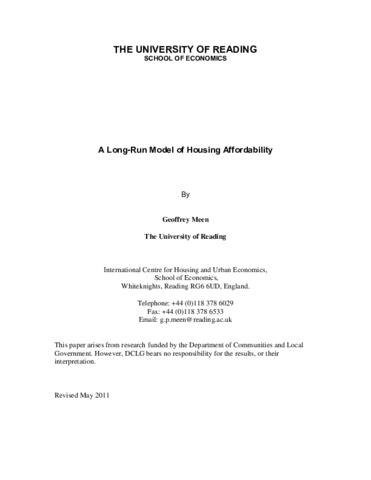 Meen, G. (2011) A long-run model of housing affordability. Housing Studies, 26 (7-8). pp. 1081-1103. ISSN 1466-1810 doi: 10.1080/02673037.2011.609327
