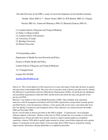 | Publisher Statement | Allen , P., Turner, S., Bartlett, W., Perotin, V., Matchaya, G. and Zamora, B. (2011) Provider diversity in the English NHS: a study of recent developments in four local health economies. Journal of Health Services Research & Policy. pp. 1-8. ISSN 1758-1060 (In Press) DOI: 10.1258/jhsrp.2011.011015 This is the final draft, after peer-review, of a manuscript published in RSM journals: www.rsmpress.com |