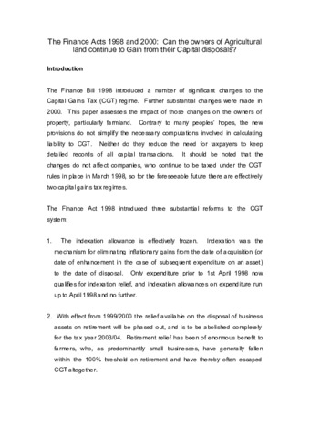 This paper seeks to analyse and discuss, from the perspective of the owners of agricultural land, the main changes to the Capital Gains Tax regime introduced in the Finance Act 1998 and subsequently amended in the Finance Act 2000. The replacement of indexation with a new Taper relief is examined, along with the phasing out of Retirement relief, and the interaction of Taper relief with Rollover relief. The opportunity for tax mitigation by the owners of agricultural land is critically examined.