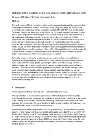 The performance of flood inundation models is often assessed using satellite observed data; however these data have inherent uncertainty. In this study we assess the impact of this uncertainty when calibrating a flood inundation model (LISFLOOD-FP) for a flood event in December 2006 on the River Dee, North Wales, UK. The flood extent is delineated from an ERS-2 SAR image of the event using an active contour model (snake), and water levels at the flood margin calculated through intersection of the shoreline vector with LiDAR topographic data. Gauged water levels are used to create a reference water surface slope for comparison with the satellite-derived water levels. Residuals between the satellite observed data points and those from the reference line are spatially clustered into groups of similar values. We show that model calibration achieved using pattern matching of observed and predicted flood extent is negatively influenced by this spatial dependency in the data. By contrast, model calibration using water elevations produces realistic calibrated optimum friction parameters even when spatial dependency is present. To test the impact of removing spatial dependency a new method of evaluating flood inundation model performance is developed by using multiple random subsamples of the water surface elevation data points. By testing for spatial dependency using Moran’s I, multiple subsamples of water elevations that have no significant spatial dependency are selected. The model is then calibrated against these data and the results averaged. This gives a near identical result to calibration using spatially dependent data, but has the advantage of being a statistically robust assessment of model performance in which we can have more confidence. Moreover, by using the variations found in the subsamples of the observed data it is possible to assess the effects of observational uncertainty on the assessment of flooding risk.