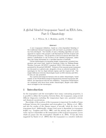 Wilcox, L. orcid id iconORCID: https://orcid.org/0000-0001-5691-1493, Hoskins, B. and Shine, K. orcid id iconORCID: https://orcid.org/0000-0003-2672-9978 (2012) A global blended tropopause based on ERA data, Part I: Climatology. Quarterly Journal of the Royal Meteorological Society, 138 (664). pp. 561-575. ISSN 1477-870X doi: 10.1002/qj.951