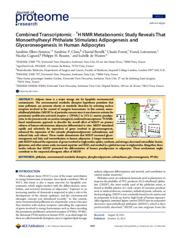 Ellero-Simatos, S., Claus, S. P., Benelli, C., Forest, C., Letourneur, F., Cagnard, N., Beaune, P. H. and de Waziers, I. (2011) Combined transcriptomic-(1)H NMR metabonomic study reveals yhat monoethylhexyl phthalate stimulates adipogenesis and glyceroneogenesis in human adipocytes. Journal of Proteome Research, 10 (12). pp. 5493-5502. ISSN 1535-3907 doi: 10.1021/pr200765v