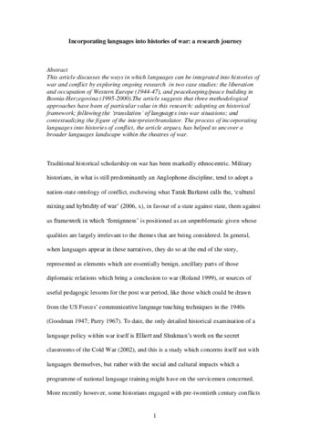 This article discusses the ways in which languages can be integrated into histories of war and conflict, by exploring ongoing research in two case studies: the liberation and occupation of Western Europe (1944–47), and peacekeeping/peace building in Bosnia-Herzegovina (1995–2000). The article suggests that three methodological approaches have been of particular value in this research: adopting an historical framework; following the “translation” of languages into war situations; and contextualizing the figure of the interpreter/translator. The process of incorporating languages into histories of conflict, the article argues, has helped to uncover a broader languages landscape within the theatres of war.