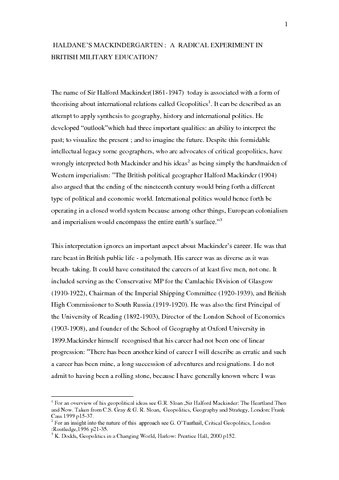 Sloan, G. (2012) Haldane's Mackindergarten: a radical experiment in British military education. War in History, 19 (3). pp. 322-352. ISSN 1477-0385 doi: 10.1177/0968344512440399