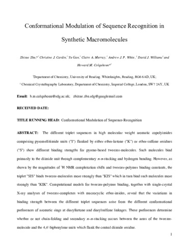 The different triplet sequences in high molecular weight aromatic copolyimides comprising pyromellitimide units ("I") flanked by either ether-ketone ("K") or ether-sulfone residues ("S") show different binding strengths for pyrene-based tweezer-molecules. Such molecules bind primarily to the diimide unit through complementary π-π-stacking and hydrogen bonding. However, as shown by the magnitudes of 1H NMR complexation shifts and tweezer-polymer binding constants, the triplet "SIS" binds tweezer-molecules more strongly than "KIS" which in turn bind such molecules more strongly than "KIK". Computational models for tweezer-polymer binding, together with single-crystal X-ray analyses of tweezer-complexes with macrocyclic ether-imides, reveal that the variations in binding strength between the different triplet sequences arise from the different conformational preferences of aromatic rings at diarylketone and diarylsulfone linkages. These preferences determine whether or not chain-folding and secondary π−π-stacking occurs between the arms of the tweezermolecule and the 4,4'-biphenylene units which flank the central diimide residue.
