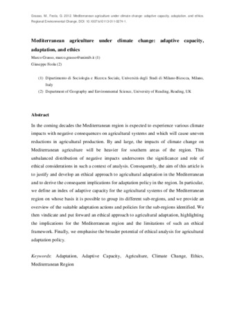 Grasso, M. and Feola, G. (2012) Mediterranean agriculture under climate change: adaptive capacity, adaptation, and ethics. Regional Environmental Change, 12 (3). pp. 607-618. ISSN 1436-378X doi: 10.1007/s10113-011-0274-1