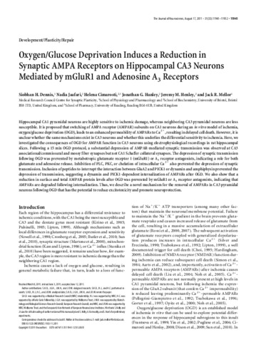 Dennis, S., Jaafari, N., Cimarosti, H., Hanley, J. G., Henley, J. M. and Mellor, J. R. (2011) Oxygen/Glucose deprivation induces a reduction in synaptic AMPA receptors on hippocampal CA3 neurons mediated by mGluR1 and adenosine A3 receptors. The Journal of Neuroscience, 31 (33). pp. 11941-11952. ISSN 1529-2401 doi: 10.1523/JNEUROSCI.1183-11.2011
