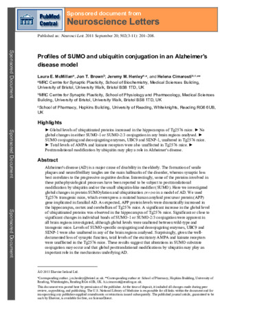 McMillan, L. E., Brown, J. T., Henley, J. M. and Cimarosti, H. (2011) Profiles of SUMO and ubiquitin conjugation in an Alzheimer's disease model. Neuroscience Letters, 502 (3). pp. 201-208. ISSN 0304-3940 doi: 10.1016/j.neulet.2011.07.045