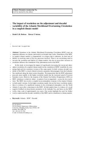 Hodson, D. L. R. orcid id iconORCID: https://orcid.org/0000-0001-7159-6700 and Sutton, R. T. orcid id iconORCID: https://orcid.org/0000-0001-8345-8583 (2012) The impact of resolution on the adjustment and decadal variability of the Atlantic Meridional Overturning Circulation in a coupled climate model. Climate Dynamics, 39 (12). pp. 3057-3073. ISSN 1432-0894 doi: 10.1007/s00382-012-1309-0