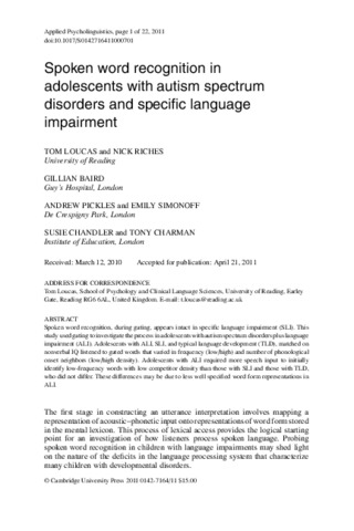 Spoken word recognition in adolescents with autism spectrum disorders and specific language impairment.