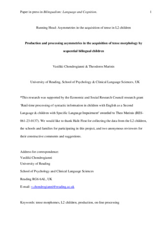 Chondrogianni, V. and Marinis, T. (2012) Production and processing asymmetries in the acquisition of tense morphology by sequential bilingual children. Bilingualism: Language and Cognition, 15 (1). pp. 5-21. ISSN 1469-1841 doi: 10.1017/S1366728911000368 (Special Issue 01 Bilingual children with specific language impairment)