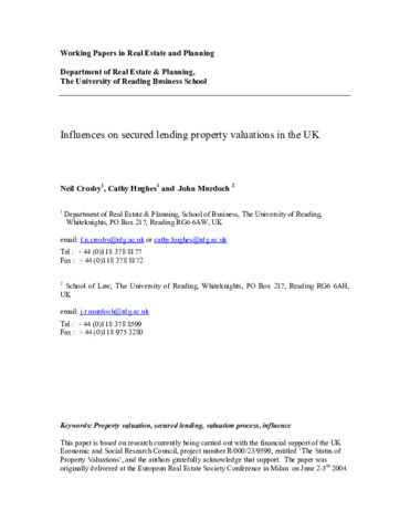 Crosby, N., Hughes, C. and Murdoch, J., (2004) Influences on secured lending property valuations in the UK. Working Papers in Real Estate & Planning. 14/04. Working Paper. University of Reading, Reading. pp26.