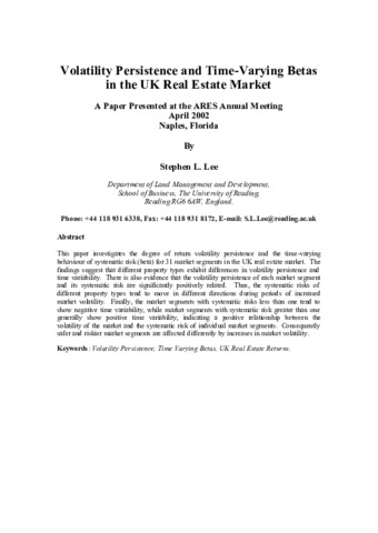 Lee, S., (2002) Volatility persistence and time-varying betas in the UK real estate market. Working Papers in Land Management & Development. 05/02. Working Paper. University of Reading, Reading. pp18.