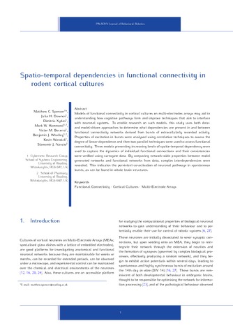 Spencer, M. C., Downes, J. H., Xydas, D., Hammond, M. W., Becerra, V. M., Whalley, B. J., Warwick, K. and Nasuto, S. orcid id iconORCID: https://orcid.org/0000-0001-9414-9049 (2011) Spatio-temporal dependencies in functional connectivity in rodent cortical cultures. Paladyn, 3 (3). pp. 156-163. ISSN 2081-4836 doi: 10.2478/s13230-012-0002-7