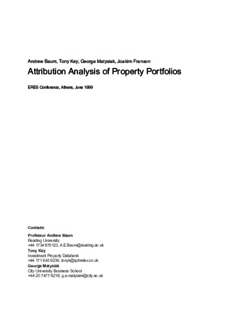 Baum, A., Key, T., Matysiak, G. and Franson, J., (2000) Attribution analysis of property portfolios. Working Papers in Land Management & Development. 10/00. Working Paper. University of Reading, Reading. pp24.