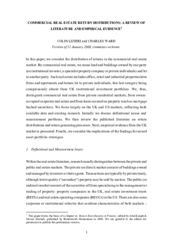Lizieri, C. and Ward, C., (2000) Commercial real estate return distributions: a review of literature and empirical evidence. Working Papers in Land Management & Development. 01/00. Working Paper. University of Reading, Reading. pp37.