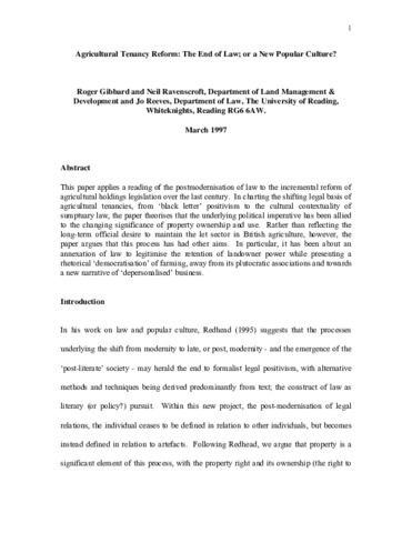 Gibbard, R. and Ravenscroft, N., (1997) Agricultural tenancy reform: the end of law; or a new popular culture? Working Papers in Land Management & Development. 03/97. Working Paper. University of Reading, Reading. pp24.