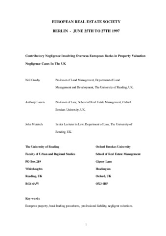 Crosby, N., Lavers, A. and Murdoch, J., (1997) Contributory negligence involving overseas European banks in property valuation negligence cases in the UK. Working Papers in Land Management & Development. 04/97. Working Paper. University of Reading, Reading. pp38.