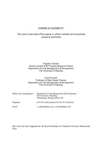 Gibson, V. and Lizieri, C., (1999) Change & flexibility: the role of serviced office space in corporate real estate portfolios and office markets. Working Papers in Land Management & Development. 01/99. Working Paper. University of Reading, Reading. pp34.