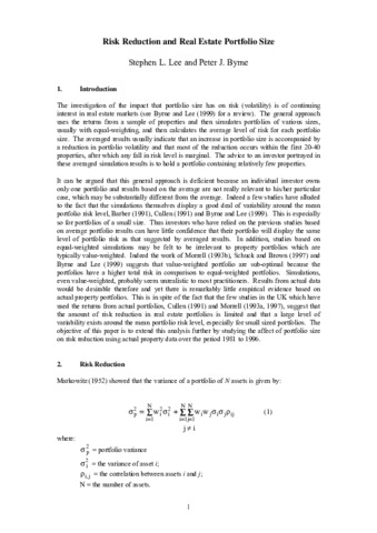 Lee, S. L. and Byrne, P. J., (1999) Risk reduction and real estate portfolio size. Working Papers in Land Management & Development. 08/99. Working Paper. University of Reading, Reading. pp16.