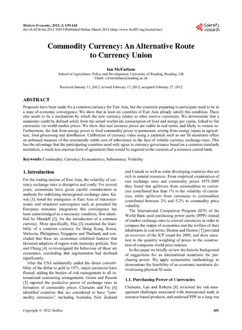 McFarlane, I. (2012) Commodity currency: an alternative route to currency union. Modern Economy, 3 (2). pp. 139-144. ISSN 2152-7261 doi: 10.4236/me.2012.32019