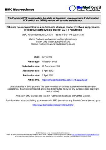 Carbone, M., Duty, S. and Rattray, M. (2012) Riluzole neuroprotection in a parkinson’s disease model involves suppression of reactive astrocytosis but not GLT-1 regulation. BMC Neuroscience, 13 (1). 38. ISSN 1471-2202 doi: 10.1186/1471-2202-13-38