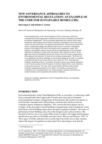 Environmental policy in the United Kingdom (UK) is witnessing a shift from command-and-control approaches towards more innovation-orientated environmental governance arrangements. These governance approaches are required which create institutions which support actors within a domain for learning not only about policy options, but also about their own interests and preferences. The need for construction actors to understand, engage and influence this process is critical to establishing policies which support innovation that satisfies each constituent’s needs. This capacity is particularly salient in an era where the expanding raft of environmental regulation is ushering in system-wide innovation in the construction sector. In this paper, the Code for Sustainable Homes (the Code) in the UK is used to demonstrate the emergence and operation of these new governance arrangements. The Code sets out a significant innovation challenge for the house-building sector with, for example, a requirement that all new houses must be zero-carbon by 2016. Drawing upon boundary organisation theory, the journey from the Code as a government aspiration, to the Code as a catalyst for the formation of the Zero Carbon Hub, a new institution, is traced and discussed. The case study reveals that the ZCH has demonstrated boundary organisation properties in its ability to be flexible to the needs and constraints of its constituent actors, yet robust enough to maintain and promote a common identity across regulation and industry boundaries.