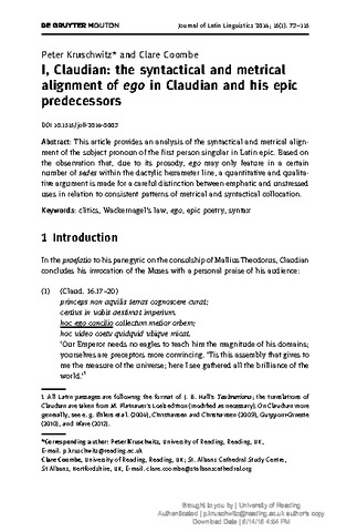 Kruschwitz, P. and Coombe, C. (2016) I, Claudian: the syntactical and metrical alignment of ego in Claudian and his epic predecessors. Journal of Latin Linguistics, 15 (1). pp. 73-115. ISSN 2194-8747 doi: 10.1515/joll-2016-0003