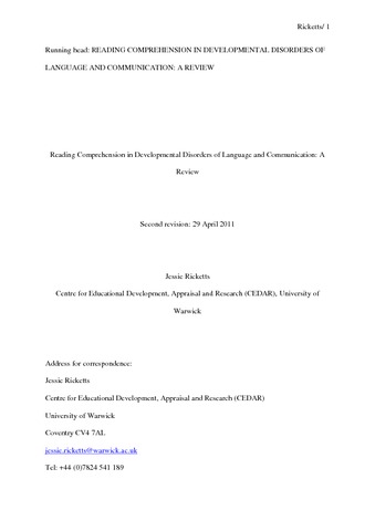 Ricketts, J. (2011) Research review: reading comprehension in developmental disorders of language and communication. Journal of Child Psychology and Psychiatry, 52 (11). pp. 1111-1123. ISSN 0021-9630 doi: 10.1111/j.1469-7610.2011.02438.x