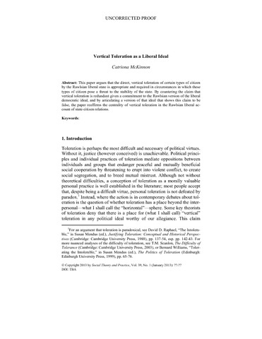 McKinnon, C. (2013) Vertical toleration as a liberal ideal. Social Theory and Practice, 39 (1). pp. 1-18. ISSN 0037-802X doi: 10.5840/soctheorpract20133911