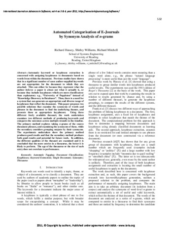 Hussey, R., Williams, S. and Mitchell, R. (2011) Automated categorisation of e-journals by synonym analysis of n-grams. The International Journal on Advances in Software, 4 (3-4). pp. 532-542. ISSN 1942-2628