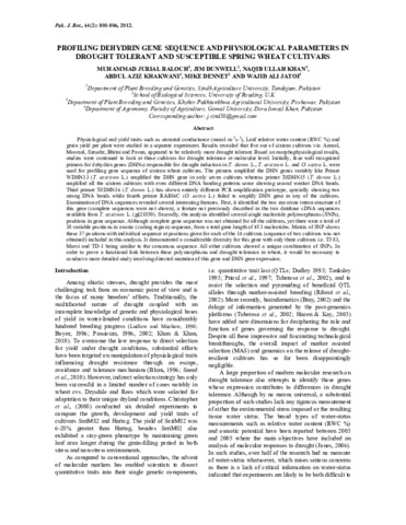 Profiling dehydrin gene sequence and physiological parameters in drought tolerant and susceptible spring wheat cultivars.