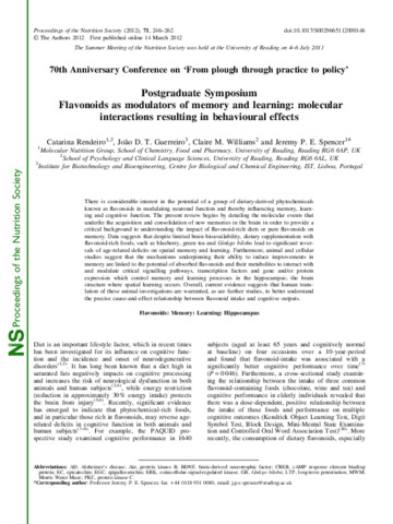 Rendeiro, C., Guerreiro, J. D.T., Williams, C. orcid id iconORCID: https://orcid.org/0000-0003-4452-671X and Spencer, J. orcid id iconORCID: https://orcid.org/0000-0003-2931-7274 (2012) Flavonoids as modulators of memory and learning: molecular interactions resulting in behavioural effects. Proceedings of the Nutrition Society, 71 (2). pp. 246-262. ISSN 1475-2719 doi: 10.1017/S0029665112000146