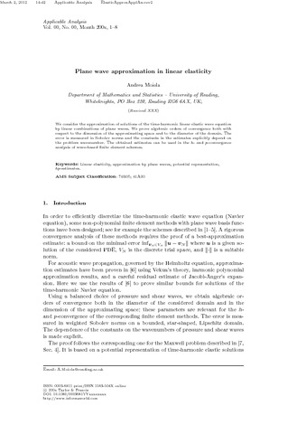 Moiola, A. (2013) Plane wave approximation in linear elasticity. Applicable Analysis, 92 (6). pp. 1299-1307. ISSN 0003-6811 doi: 10.1080/00036811.2012.671300