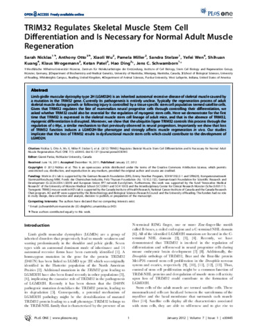 Nicklas, S., Otto, A., Wu, X., Millar, P., Stelzer, S., Wen, Y., Kuang, S., Wrogemann, K., Patel, K., Ding, H. and Schwanborn, J. C. (2012) TRIM32 regulates skeletal muscle stem cell differentiation and is necessary for normal adult muscle regeneration. PLoS ONE, 7 (1). e30445. ISSN 1932-6203 doi: 10.1371/journal.pone.0030445