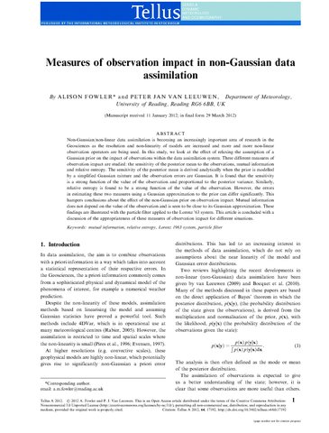 ABSTRACT Non-Gaussian/non-linear data assimilation is becoming an increasingly important area of research in the Geosciences as the resolution and non-linearity of models are increased and more and more non-linear observation operators are being used. In this study, we look at the effect of relaxing the assumption of a Gaussian prior on the impact of observations within the data assimilation system. Three different measures of observation impact are studied: the sensitivity of the posterior mean to the observations, mutual information and relative entropy. The sensitivity of the posterior mean is derived analytically when the prior is modelled by a simplified Gaussian mixture and the observation errors are Gaussian. It is found that the sensitivity is a strong function of the value of the observation and proportional to the posterior variance. Similarly, relative entropy is found to be a strong function of the value of the observation. However, the errors in estimating these two measures using a Gaussian approximation to the prior can differ significantly. This hampers conclusions about the effect of the non-Gaussian prior on observation impact. Mutual information does not depend on the value of the observation and is seen to be close to its Gaussian approximation. These findings are illustrated with the particle filter applied to the Lorenz ’63 system. This article is concluded with a discussion of the appropriateness of these measures of observation impact for different situations.