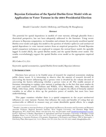 Lacombe, D. J., Holloway, G. J. orcid id iconORCID: https://orcid.org/0000-0002-2058-4504 and Shaughnessy, T. M. (2014) Bayesian estimation of the spatial Durbin error model with an application to voter turnout in the 2004 presidential election. International Regional Science Review, 37 (3). pp. 298-327. ISSN 1552-6925 doi: 10.1177/0160017612452133