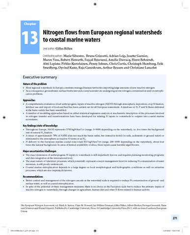 Billen, G., Silvestre, M., Grizzetti, B., Leip, A., Garnier, J., Voss, M., Howarth, R., Bouraoui, F., Lepisto, A., Kortelainen, P., Johnes, P., Curtis, C., Humborg, C., Smedburg, E., Kaste, O., Ganeshram, R., Beusen, A. and Lancelot, C. (2011) Nitrogen flows from European watersheds to coastal marine waters. In: Sutton, M. A. (ed.) The European Nitrogen Assessment. Cambridge University Press, Cambridge, pp. 271-297. ISBN 9781107006126