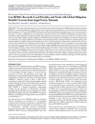 Bolin, A., Mustalahti, I., Boyd, E. and Paavola, J. (2012) Can REDD+ reconcile local priorities and needs with global mitigation benefits? lessons from Angai Forest, Tanzania. Ecology and Society, 17 (1). 16. ISSN 1708-3087 doi: 10.5751/ES-04498-170116