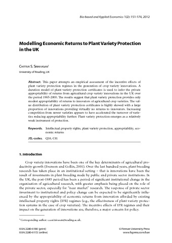 | Uncontrolled Keywords | Intellectual Property Rights, Plant Variety Protection, Appropriability, Economic returns |