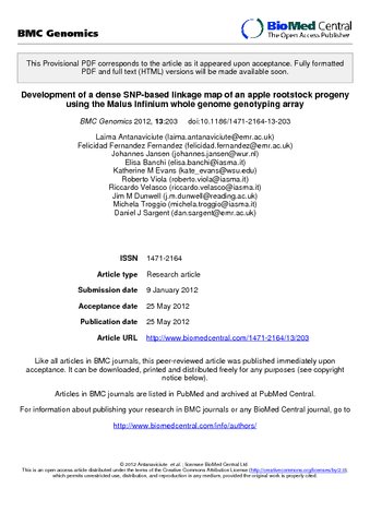 Antanaviciute, L., Fernandez-Fernandez, F., Jansen, J., Banchi, E., Evans, K. M., Viola, R., Velasco, R., Dunwell, J. M. orcid id iconORCID: https://orcid.org/0000-0003-2147-665X, Troggio, M. and Sargent, D. J. (2012) Development of a dense SNP-based linkage map of an apple rootstock progeny using the Malus Infinium whole genome genotyping array. BMC Genomics, 13. 203. ISSN 1471-2164 doi: 10.1186/1471-2164-13-203
