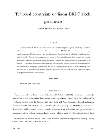 Quaife, T. orcid id iconORCID: https://orcid.org/0000-0001-6896-4613 and Lewis, P. (2010) Temporal constraints on linear BRDF model parameters. IEEE Transactions on Geoscience and Remote Sensing, 48 (5). pp. 2445-2450. ISSN 0196-2892 doi: 10.1109/TGRS.2009.2038901