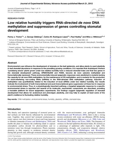 Tricker, P., Gibbings, J.G., López, C. M. R., Hadley, P. and Wilkinson, M. J. (2012) Low relative humidity triggers RNA-directed de novo DNA methylation and suppression of genes controlling stomatal development. Journal of Experimental Botany, 63 (10). pp. 3799-3813. ISSN 0022-0957 doi: 10.1093/jxb/ers076