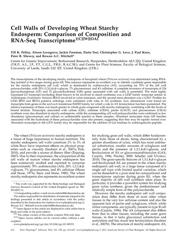Pellny, T. K., Lovegrove, A., Freeman, J., Tosi, P. orcid id iconORCID: https://orcid.org/0000-0003-4171-6120, Love, C. G., Knox, J. P., Shewry, P. R. and Mitchell, R. A. C. (2012) Cell walls of developing wheat starchy endosperm: comparison of composition and RNA-Seq transcriptome. Plant Physiology, 158 (2). pp. 612-627. ISSN 0032-0889 doi: 10.1104/pp.111.189191