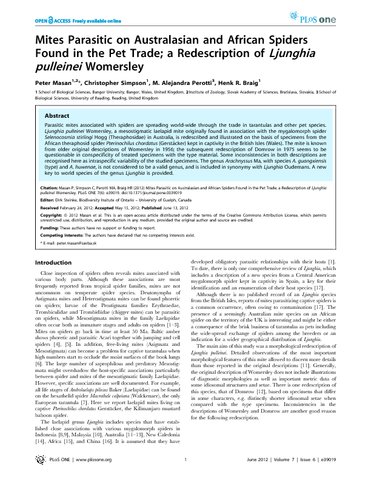 Parasitic mites associated with spiders are spreading world-wide through the trade in tarantulas and other pet species. Ljunghia pulleinei Womersley, a mesostigmatic laelapid mite originally found in association with the mygalomorph spider Selenocosmia stirlingi Hogg (Theraphosidae) in Australia, is redescribed and illustrated on the basis of specimens from the African theraphosid spider Pterinochilus chordatus (Gersta¨cker) kept in captivity in the British Isles (Wales). The mite is known from older original descriptions of Womersley in 1956; the subsequent redescription of Domrow in 1975 seems to be questionable in conspecificity of treated specimens with the type material. Some inconsistencies in both descriptions are recognised here as intraspecific variability of the studied specimens. The genus Arachnyssus Ma, with species A. guangxiensis (type) and A. huwenae, is not considered to be a valid genus, and is included in synonymy with Ljunghia Oudemans. A new key to world species of the genus Ljunghia is provided.